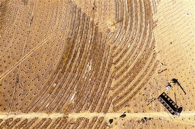 武清雍陽園林員工在河北雄安新區“千年秀林”工程施工現場施工(無人機拍攝)。