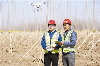 技術人員正在使用無人機系統,結合大數據管理進行智能化栽種,確保植株樹苗的位置精準達標。通訊員陳友 董鑫攝