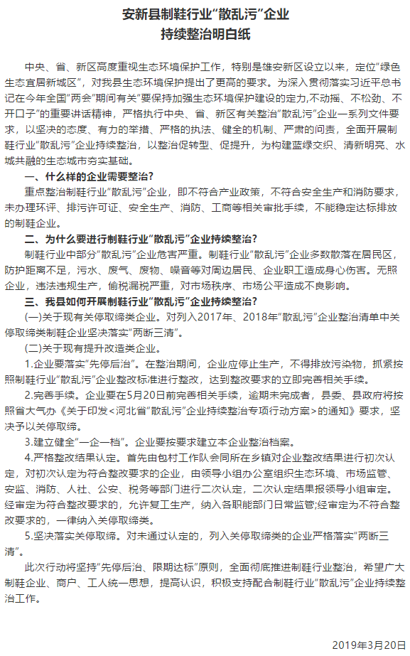 會上,安新縣全面安排部署2019年制鞋行業持續整治工作,印發《安新縣2019年制鞋行業持續整治實施方案》,以整治促轉型、促提升,從根本上解決制鞋行業“散亂污”企業問題,為新區構建藍綠交織、清新明亮、水城共融的生態城市夯實基礎。