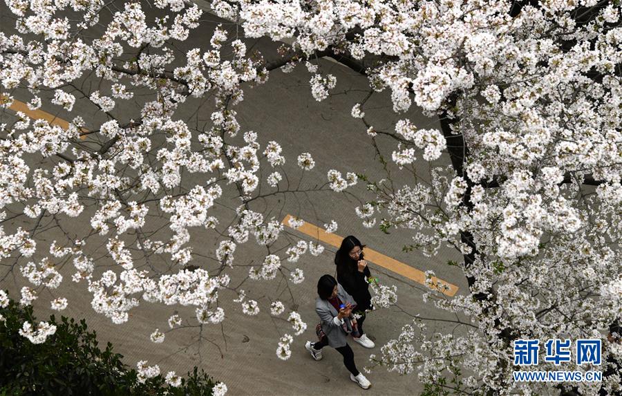 3月23日,在武漢大學(xué),人們從櫻花樹下走過。當(dāng)日,眾多游客前往武漢大學(xué)欣賞櫻花。新華社記者 程敏 攝