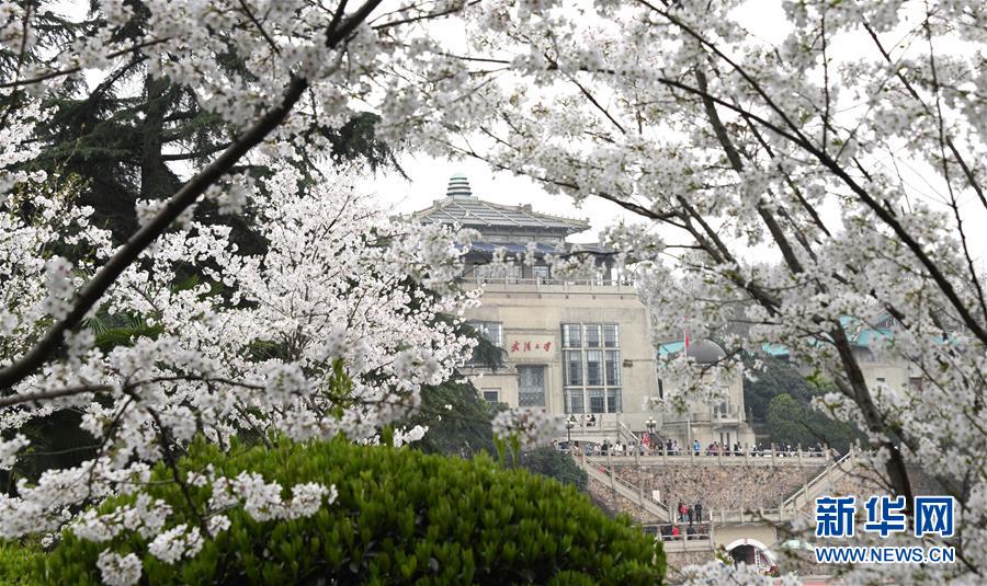 武漢大學的櫻花與建筑交相輝映(3月23日攝)。3月23日,眾多游客前往武漢大學欣賞櫻花。新華社記者 程敏 攝