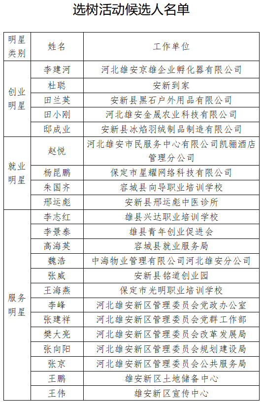 根據《河北雄安新區管理委員會印發<關于開展創業明星、就業明星和服務明星選樹活動的實施方案>的通知》(雄安政字〔2018〕40號)要求,結合新區工作實際,經三縣政府、新區各部門及雄安集團推薦,并評審,擬推薦李建河等22人為創業明星、就業明星、服務明星候選人(名單附后),現向社會予以公示,公示時間為2019年3月25日-2019年3月31日。公示期間,社會各界如對公示對象存有異議的,可以書面形式向新區公共服務局261房間反映。
