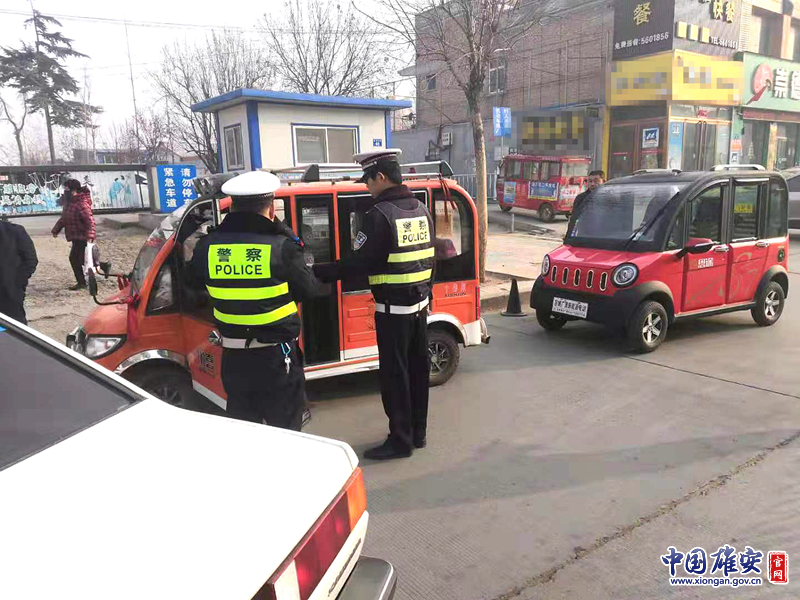 容城縣交警街頭排查非法營運電動三輪車。容城縣委宣傳部供圖