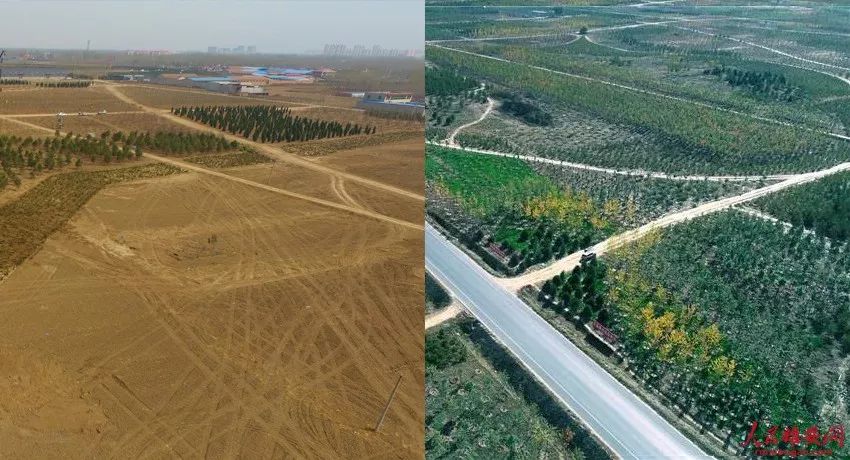 千年秀林9號地塊(雄縣)種植前后。(左圖雄安集團生態公司供圖,右圖薛志勇攝)