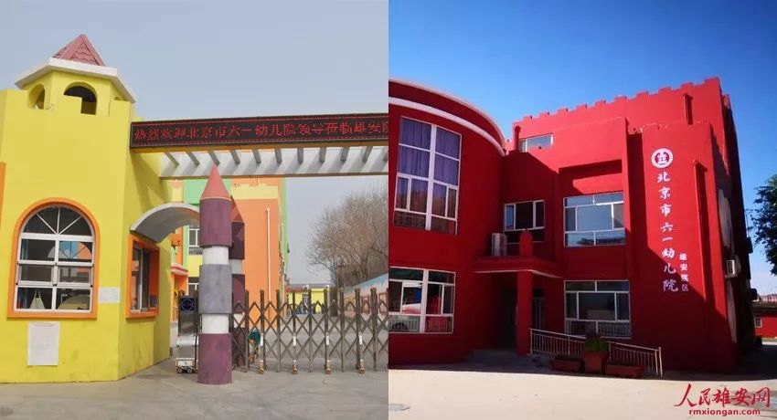 北京市六一幼兒院雄安院區掛牌前后。(左圖朱峙委攝,右圖賈東亮攝)