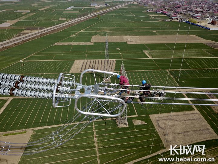 圖為國網河北電力工程施工人員正在進行耐張塔引流高空作業。