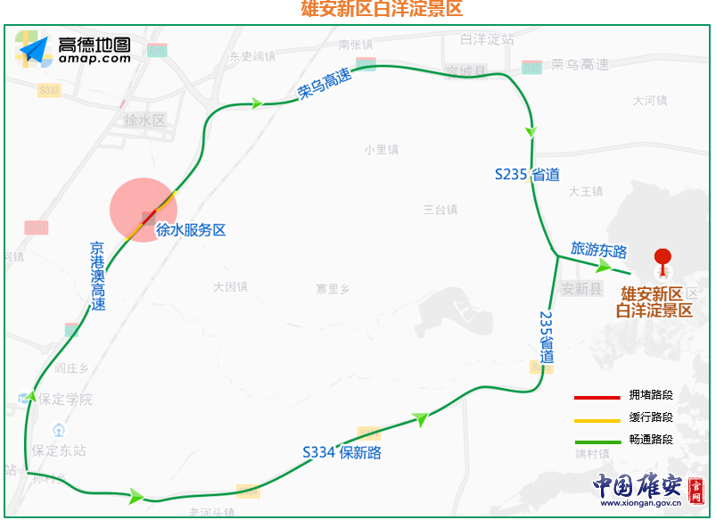 此外,高德地圖大數據相關負責人表示,游客可以走“京港澳高速-榮烏高速往南S235省道-旅游東路”抵達白洋淀景區;如果徐水服務區遇到嚴重擁堵情況,也可考慮走“S334保新路-235省道-旅游東路”抵達白洋淀景區。