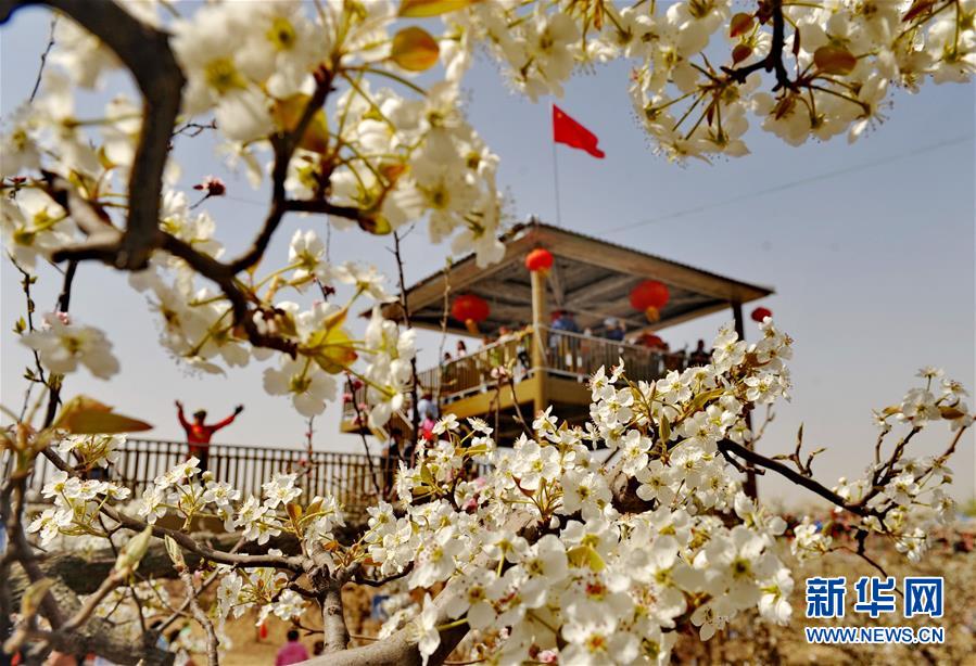 4月6日,游客在肅寧縣萬里鎮尹莊村梨園觀光臺上賞花。新華社記者楊世堯攝