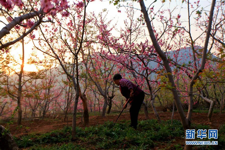 4月5日,山東省臨沂市平邑縣地方鎮辛莊村農民在桃園里鋤草。清明時節,各地農民搶抓農時開展農事作業。新華社發(武紀全 攝)