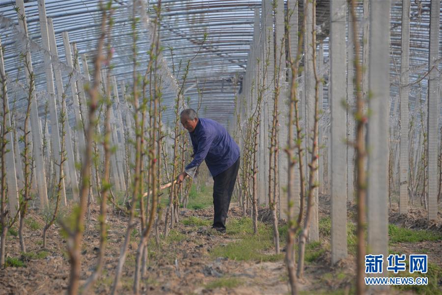 4月5日,山東省聊城市茌平縣賈寨鎮后寨村農民在大棚里為桃樹鋤草。清明時節,各地農民搶抓農時開展農事作業。新華社發(趙玉國 攝)
