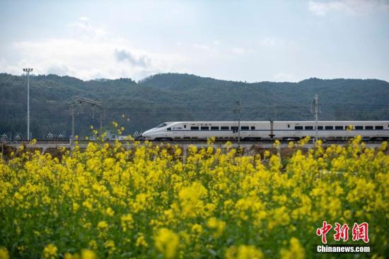 資料圖:高鐵列車穿行在油菜花間。中新社發 吳德軍 攝 圖片來源:CNSPHOTO