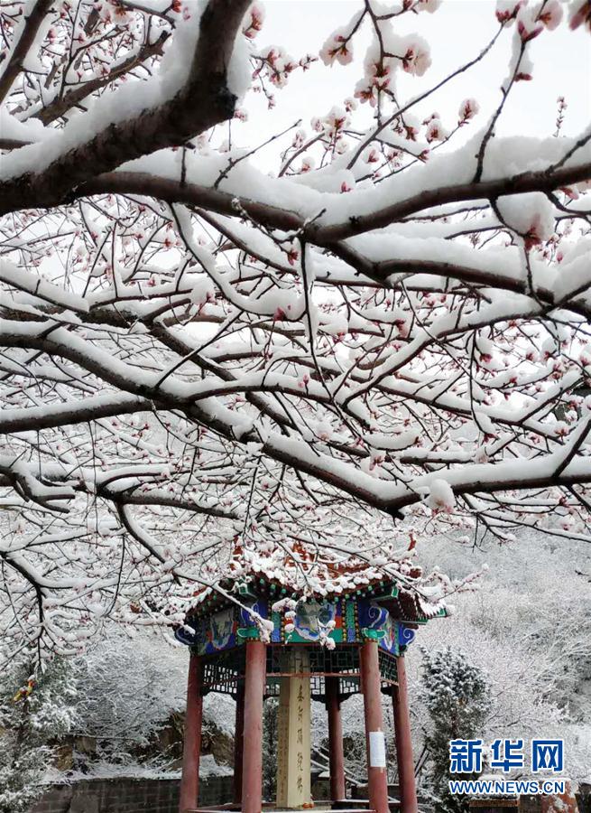 這是4月9日拍攝的張家口雞鳴山景區雪景。當日,受較強冷空氣影響,河北張家口迎來降雪。新華社發(郝少清 攝)