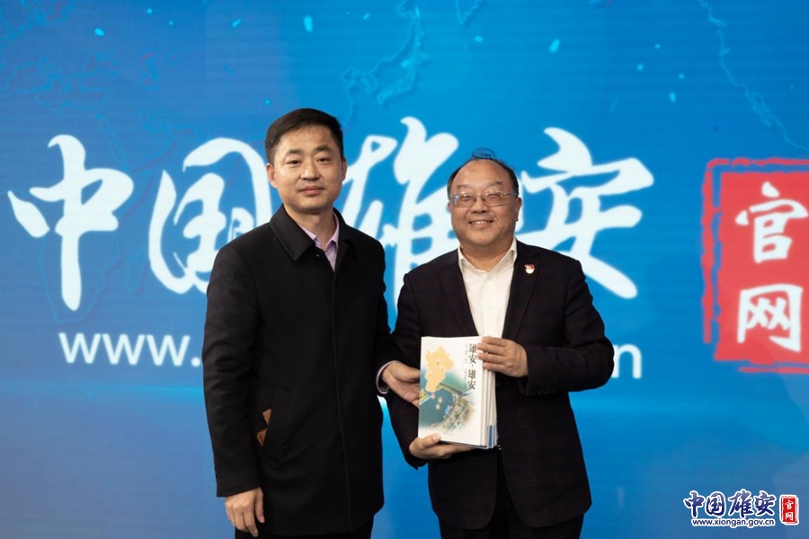 省委網(wǎng)信辦應(yīng)急指揮中心主任、應(yīng)急管理和輿情處處長、雄安新區(qū)網(wǎng)信辦主任李長斗向何繼良贈(zèng)送《雄安,雄安》。中國雄安官網(wǎng)記者毛鶴然 攝