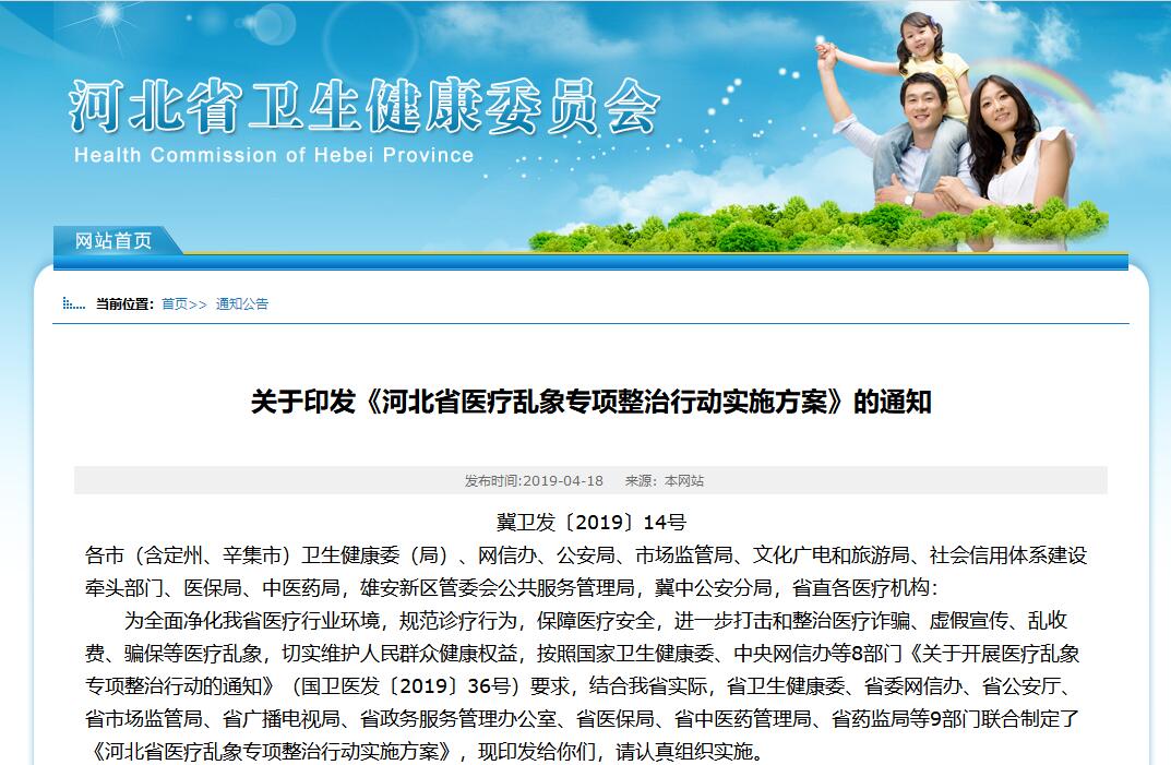 日前,河北省衛生健康委、省委網信辦、省公安廳等9部門聯合印發《河北省醫療亂象專項整治行動實施方案》,從今年4月到2020年2月,我省將在各級各類醫療機構開展醫療亂象專項整治行動,重點整治投訴舉報多、問題突出的醫療機構。