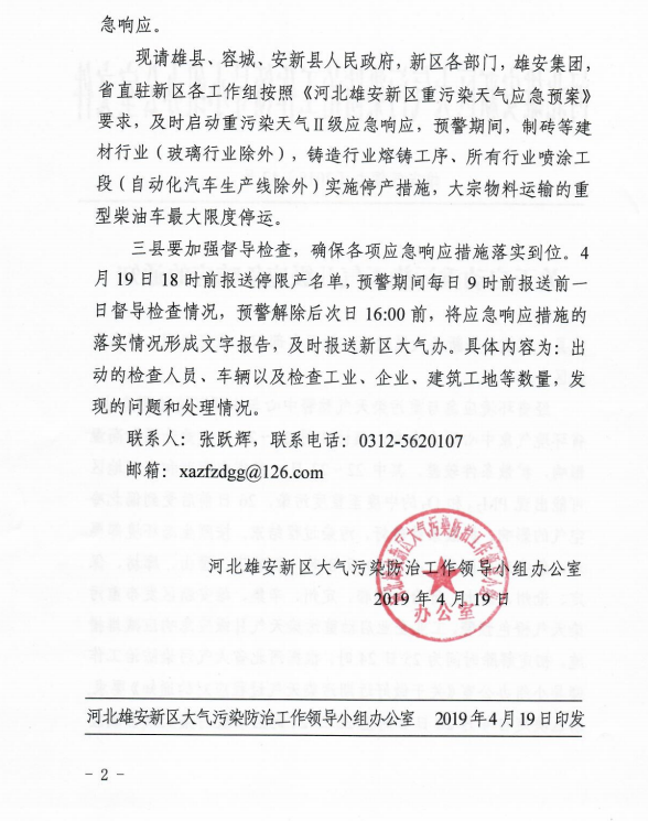 4月19日,河北雄安新區大氣污染防治領導小組辦公室發布《關于啟動重污染天氣Ⅱ級應急響應的通知》,決定自4月20日8時至25日24時啟動重污染天氣Ⅱ級應急響應。