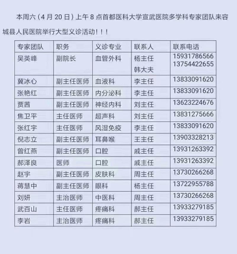 中國雄安官網4月19日電(記者朱偉琳)記者近日獲悉,首都醫科大學附屬北京婦產醫院將于4月24日在容城縣婦幼保健院舉辦大型義診活動,首都醫科大學宣武醫院將于4月20日在容城縣人民醫院舉行大型義診活動,屆時將有多個科室的20余位北京名醫專家為患者服務,群眾在家門口就能看“專家號”。