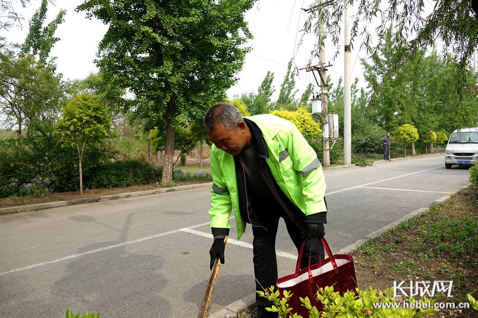 5月1日,在容城縣大水大街旁,一名環(huán)衛(wèi)工人正在清掃街頭垃圾。霍少軒 攝