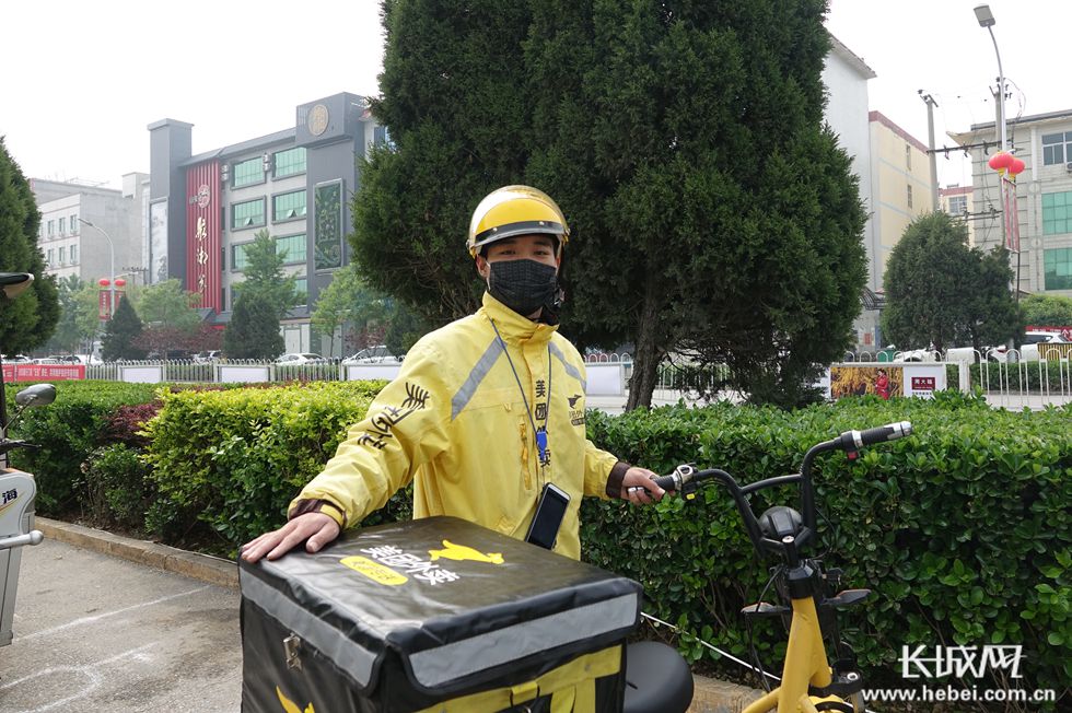 5月1日,在容城縣奧威路旁,外賣小哥正準(zhǔn)備去送打包好的外賣。霍少軒 攝