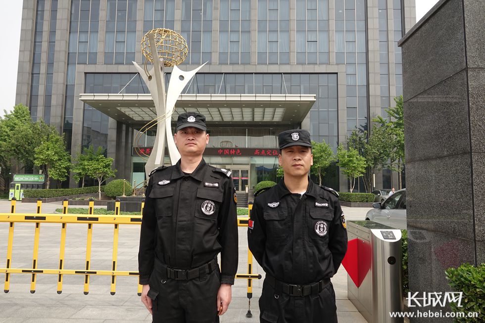 5月1日,在容城縣奧威大廈門口,兩位保安員正在值班。霍少軒 攝
