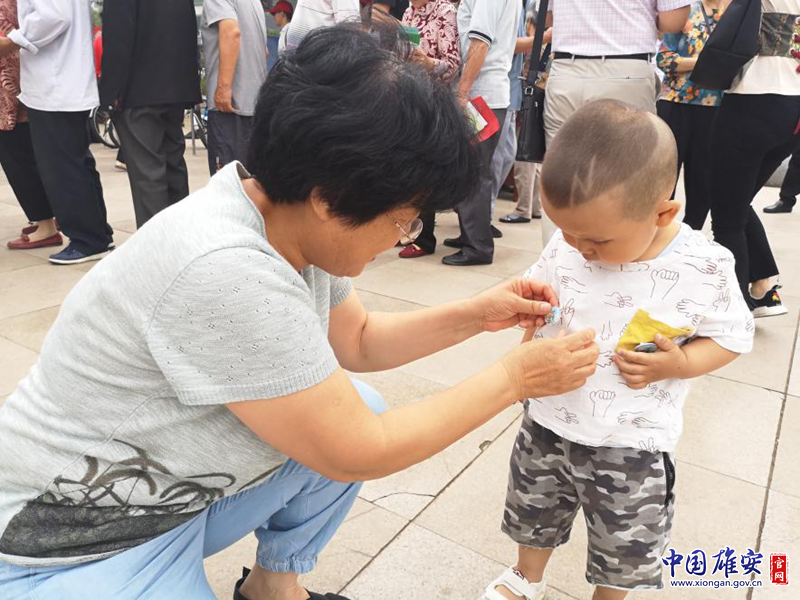老人正在為小孫子戴“走遍雄安”徽章。中國(guó)雄安官網(wǎng)發(fā)
