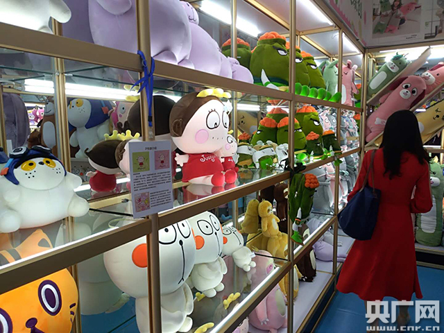 在雄安北方毛絨玩具城的展廳內,擺放著各種精美的毛絨玩具,包括新晉網紅卡通形象“眼袋熊”“美食大冒險”等,這些全都是獲得正版授權或者擁有自主品牌的玩具。