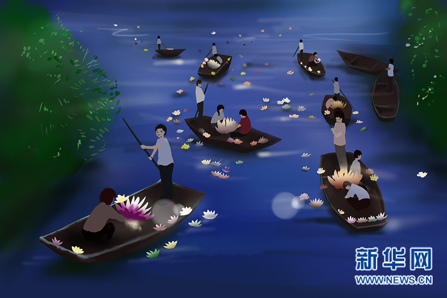 在白洋淀過端午節可是非常熱鬧的。人們纏五彩線、包葦葉粽;剪葫蘆、做香囊;插艾草、賽龍舟;聽漁歌、放荷燈。其中,這放荷燈是白洋淀的特色傳統民俗。夜晚明月高掛,點點繁星,將祈福之燈輕輕地放入水中,許下愿望,月光、星光、燈光交織在一起,妙不可言。