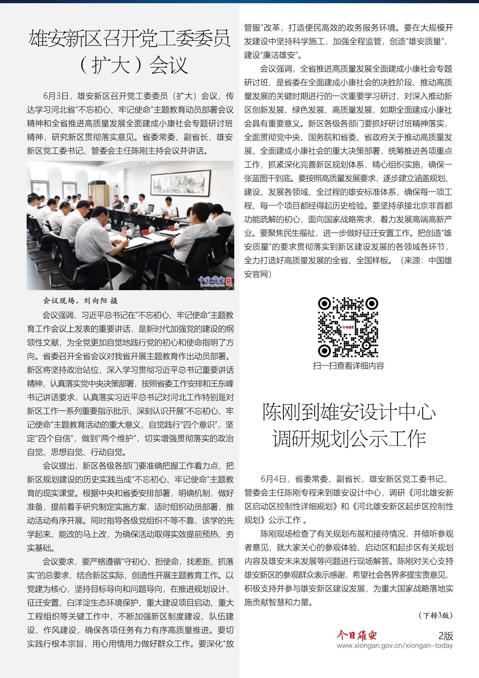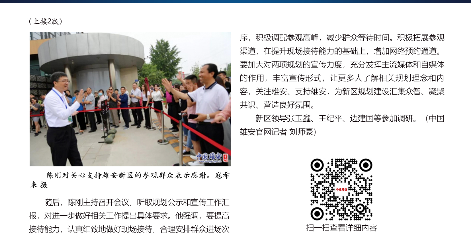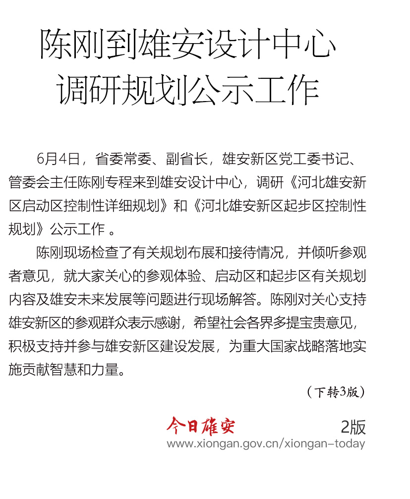 6月4日,河北省委常委、副省長,雄安新區(qū)黨工委書記、管委會主任陳剛在雄安設(shè)計(jì)中心調(diào)研《河北雄安新區(qū)啟動區(qū)控制性詳細(xì)規(guī)劃》和《河北雄安新區(qū)起步區(qū)控制性規(guī)劃》公示情況。