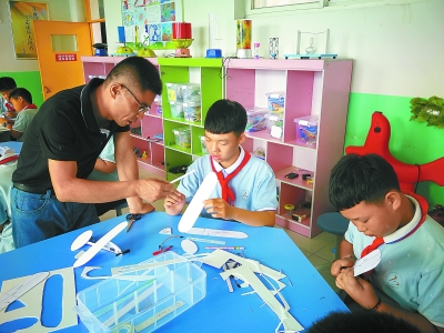 中關村三小雄安校區教師給學生上航模課,學生正在組裝電容動力航模。李如意 攝