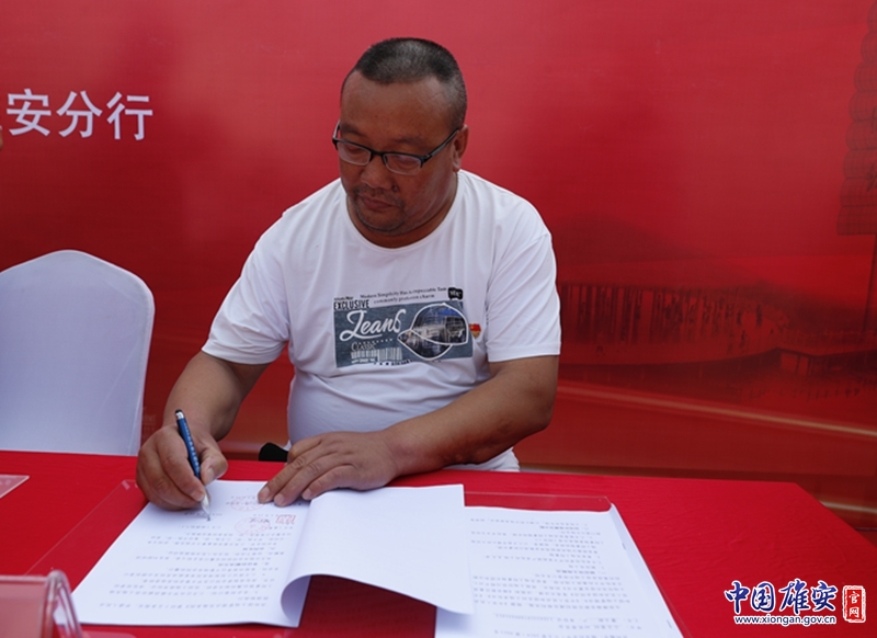 西陽村黨支部書記鄭賀安率先簽訂《雄安新區征收集體所有土地補償、青苗及其他地上附著物補償合同》。中國雄安官網記者封俊龍 攝