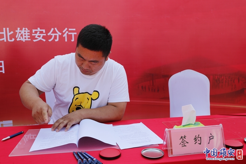 安新縣西陽村村民在《雄安新區征收集體所有土地補償、青苗及其他地上附著物補償合同》上簽字。中國雄安官網記者王京卓 攝