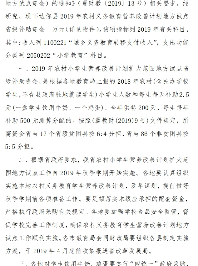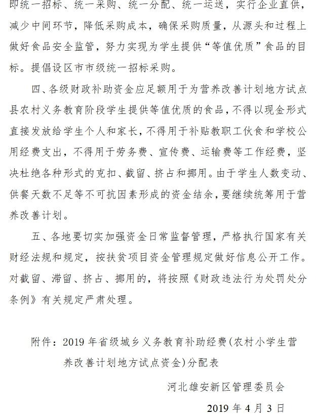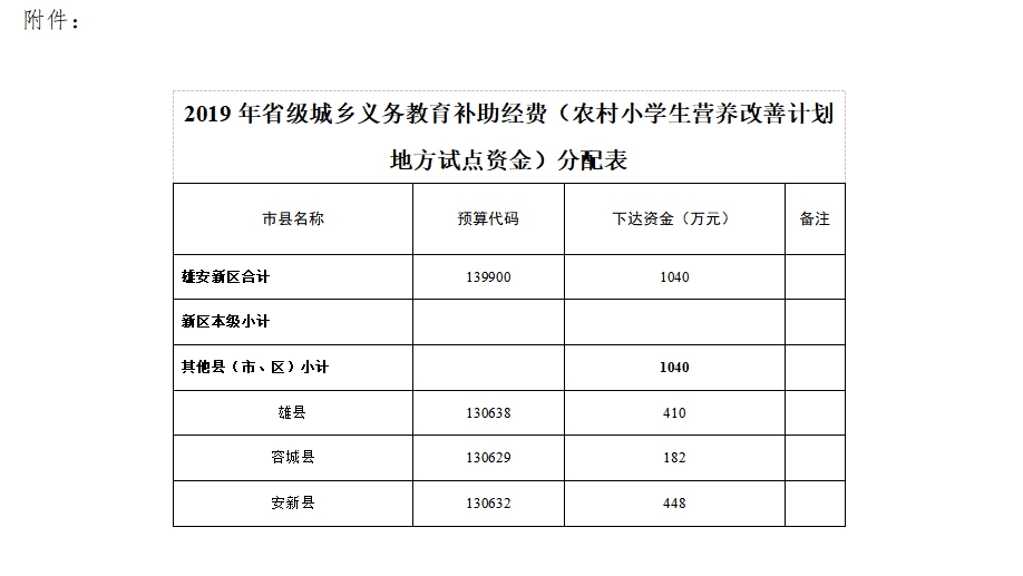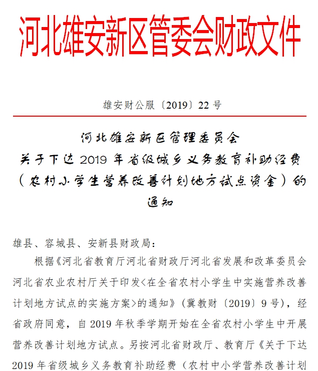 現將雄安新區下達2019年省級城鄉義務教育補助經費(農村小學生營養改善計劃地方試點資金)資金分配結果予以公告,如有異議,請向以下部門提出意見。