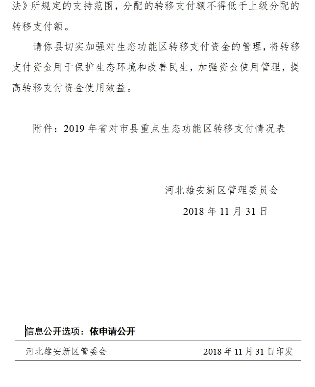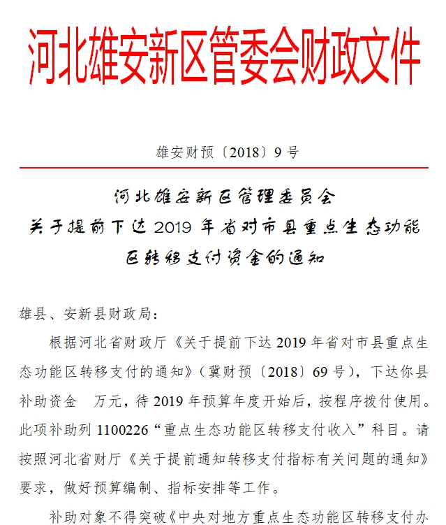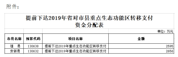 現(xiàn)將雄安新區(qū)提前下達2019年省對市縣重點生態(tài)功能區(qū)轉(zhuǎn)移支付資金資金分配結(jié)果予以公告,如有異議,請向以下部門提出意見。