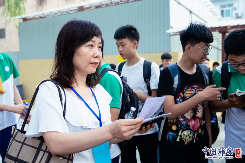 中央民族大學附屬中學雄安校區初中部(原容城鎮第一中學)政教處副校長王恩波與初三年級教師莊玲、郭麗榮也早早到達約定地點,等候考生集合,統一分發準考證。據悉,該校初中部今年共有180余名考生,由6名老師帶隊分兩組赴容城縣2個考點參加考試。