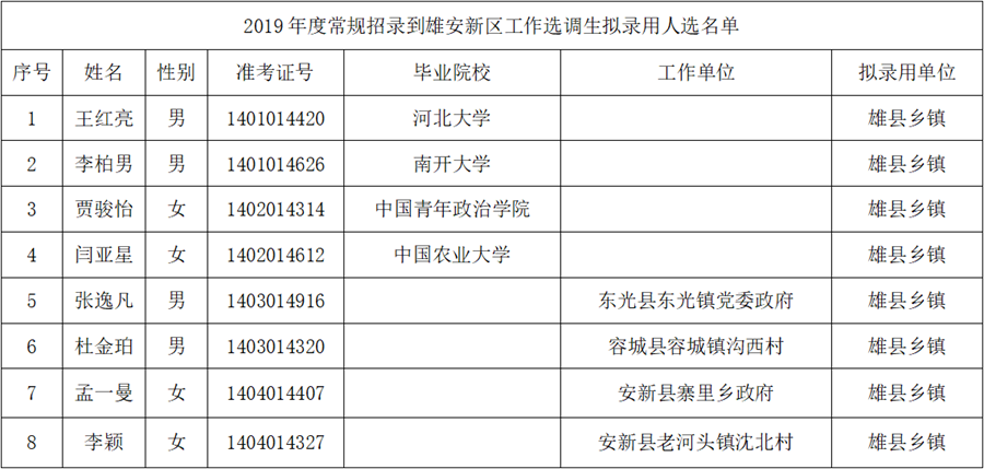 2019年度常規(guī)招錄到雄安新區(qū)工作選調生擬錄用人選名單