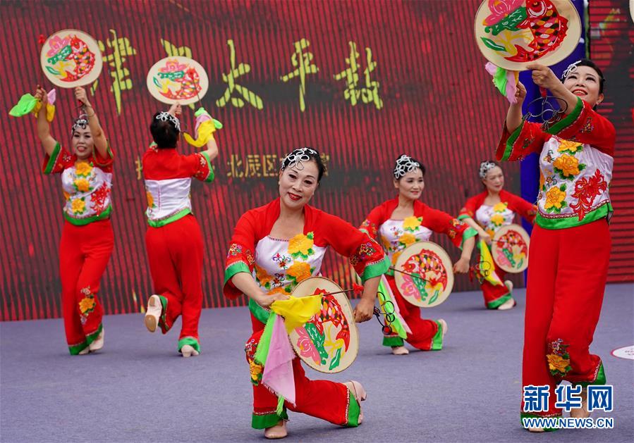 6月26日,天津市北辰區文化館飛天舞蹈隊的演員在表演《津門太平鼓》。當日,由京津冀三省市非物質文化遺產保護中心聯合主辦的“京津冀特色非物質文化遺產項目展示展演”在河北省秦皇島市撫寧區開幕。此活動為期兩天,將有來自京津冀地區的19支隊伍共300余名演員為觀眾獻上傳統非遺表演。新華社記者 楊世堯 攝