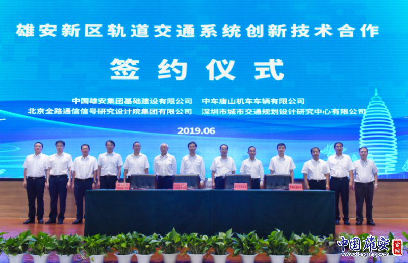 中國雄安官網6月27日電 近日,中國雄安集團基礎建設有限公司與中國中車唐山機車車輛有限公司、中國通號集團北京全路通信信號研究設計院、深圳市城市交通規劃設計研究中心在雄安市民服務中心簽署《雄安新區軌道交通系統創新技術合作協議》。雄安新區黨工委副書記、管委會常務副主任,雄安集團黨委書記、董事長田金昌,中國中車集團黨委副書記、總經理孫永才等出席簽約儀式。