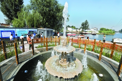 安新縣安新鎮(zhèn)王家寨四周環(huán)水,有“淀中翡翠”之稱。上午,村民們正在村口碼頭熱情招呼上岸的游客。但與往年不同的是,碼頭廣場(chǎng)今年多了一處噴泉小景觀,嘩嘩的清水沖高數(shù)米回落,不僅為炎炎夏日添一絲涼意,也讓村口多幾分精致感。