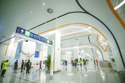 在線路的另一端,大興機場站站廳無縫對接機場和高鐵換乘空間。事先完成網(wǎng)上值機的旅客,出閘機后只需步行約百米,就可直接進入機場安檢區(qū)。沒有辦理值機手續(xù)的旅客,搭乘電梯也可進入航站樓各樓層。在裝修設(shè)計風(fēng)格上,地鐵大興機場站與機場保持一致,以“新時代的空中絲路”為主題,通過行云流水的“飄帶”引導(dǎo)客流,以中國紅為點綴,營造與機場換乘廳統(tǒng)一的空間效果,體現(xiàn)國門第一線的中國文化、北京韻味。