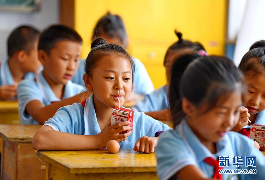 9月1日,河北省樂亭縣閆各莊鎮中心小學的孩子們在課間享用營養餐。從9月1日起,河北省全省農村小學生都能享受到免費營養餐。營養餐供餐采取課間加餐模式,每天為每個孩子提供一盒學生飲用奶和一個雞蛋。新華社記者 楊世堯 攝