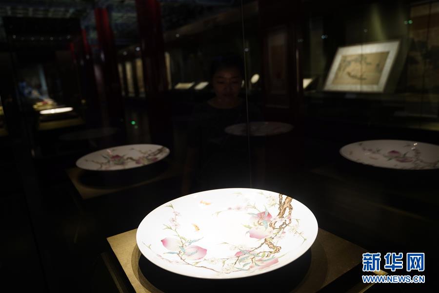 9月2日,觀眾在參觀粉彩九桃圖盤。 當日,“萬紫千紅——中國古代花木題材文物特展”在北京故宮博物院開幕。展覽分為“四時寫生”“清雅逸趣”“寓情寄意”三個單元,共展出文物307件。新華社記者金良快攝