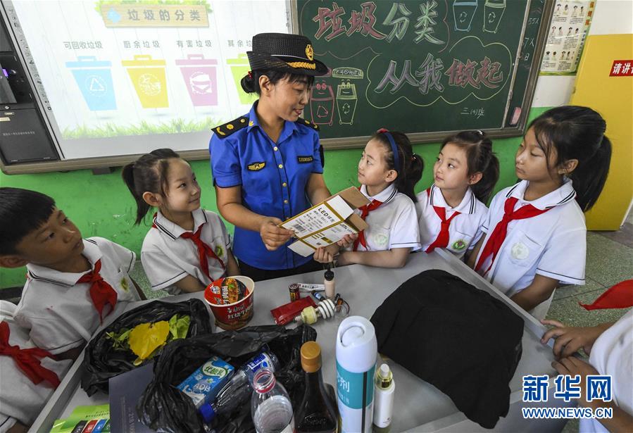9月3日,河北省文安縣城市管理綜合行政執法局工作人員在文安縣第二小學為學生們講解垃圾分類知識。 今年以來,河北省廊坊市文安縣深入開展“垃圾分類進校園”主題活動,通過講解和現場演示,讓同學們深入了解垃圾分類的益處,提倡綠色生活。新華社記者李曉果攝