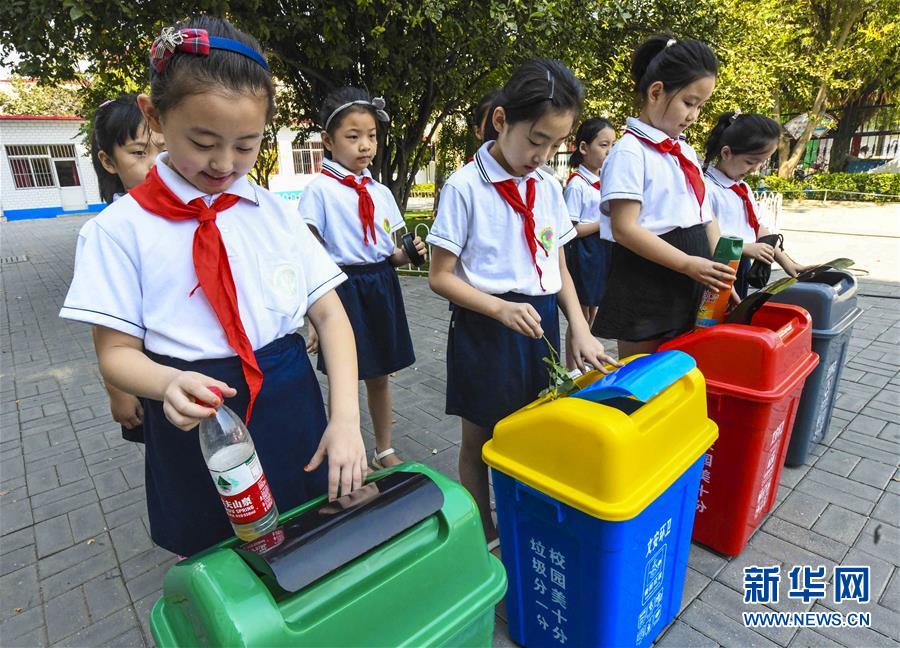 9月3日,河北省文安縣第二小學學生將不同種類垃圾投入垃圾桶中。 今年以來,河北省廊坊市文安縣深入開展“垃圾分類進校園”主題活動,通過講解和現場演示,讓同學們深入了解垃圾分類的益處,提倡綠色生活。新華社記者李曉果攝
