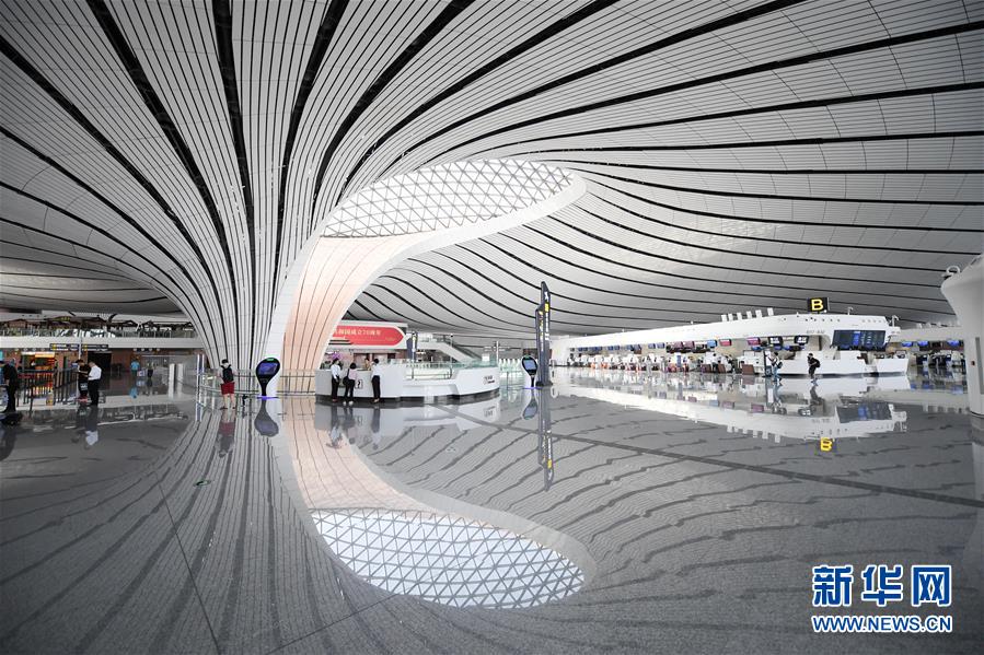 9月4日拍攝的北京大興國際機場內部。隨著各項驗收的完成,北京大興國際機場投運在即。北京大興國際機場是目前世界最大的綜合交通樞紐,擁有全球首座高鐵地下穿行的機場航站樓、全球首座雙層出發雙層到達的航站樓、世界最大單體航站樓。新華社記者 張晨霖 攝