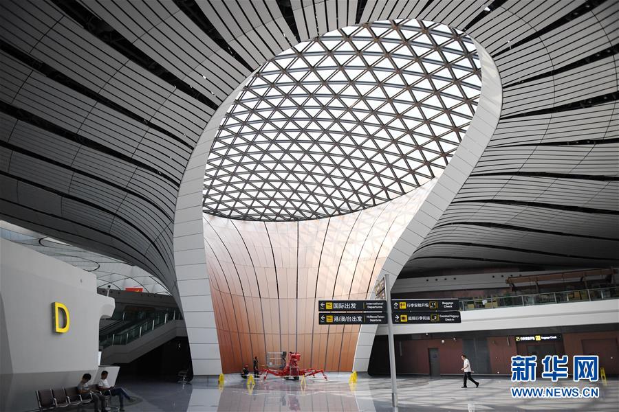 9月4日拍攝的北京大興國際機場內部。隨著各項驗收的完成,北京大興國際機場投運在即。北京大興國際機場是目前世界最大的綜合交通樞紐,擁有全球首座高鐵地下穿行的機場航站樓、全球首座雙層出發雙層到達的航站樓、世界最大單體航站樓。新華社記者 張晨霖 攝