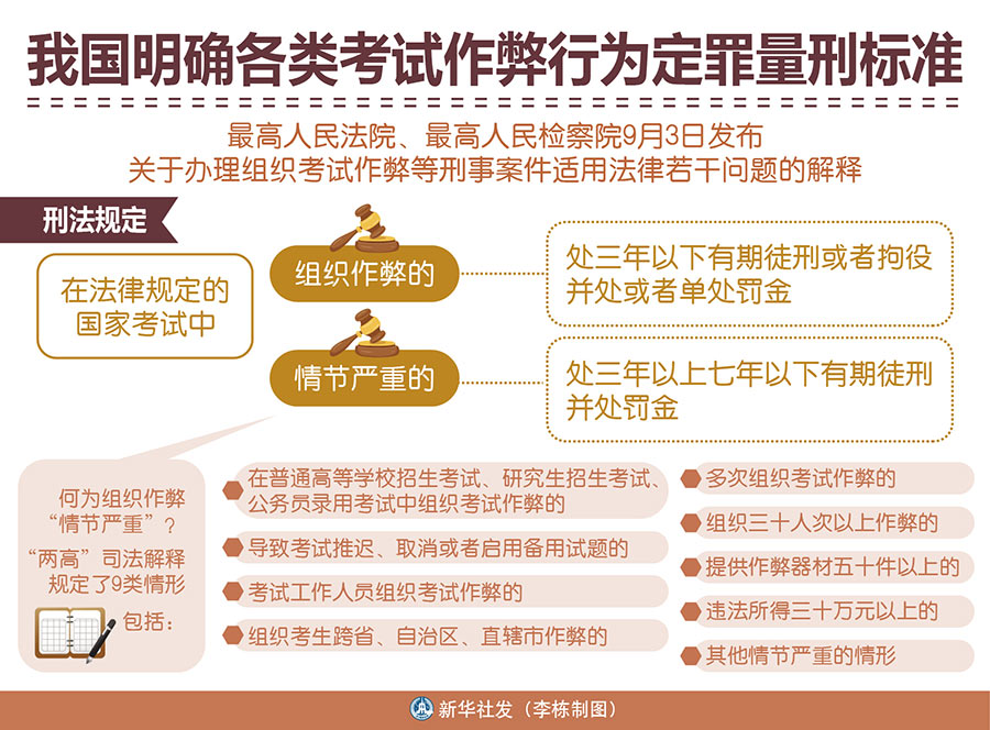 17.最高人民法院、最高人民檢察院近日發(fā)布考試作弊刑事案件司法解釋,明確國(guó)家教育考試、公務(wù)員錄用考試等四類考試作弊行為定罪量刑標(biāo)準(zhǔn),加大對(duì)考試作弊犯罪懲治力度。