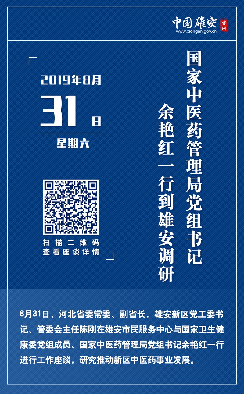 8月31日,河北省委常委、副省長,雄安新區黨工委書記、管委會主任陳剛在雄安市民服務中心與國家衛生健康委黨組成員、國家中醫藥管理局黨組書記余艷紅一行進行工作座談。