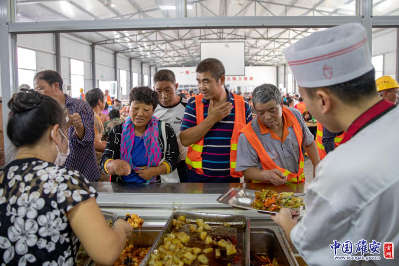 京雄城際鐵路雄安站房一標(biāo)工人們正在打飯。中國雄安官網(wǎng)記者馬夢迪 攝