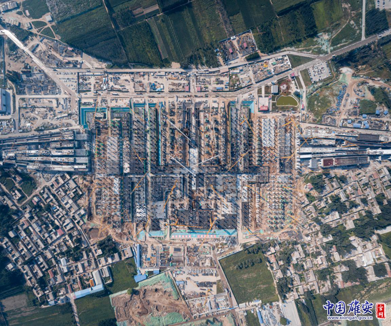 京雄城際鐵路雄安站房施工現(xiàn)場航拍圖。中國雄安官網(wǎng)記者馬夢迪 攝