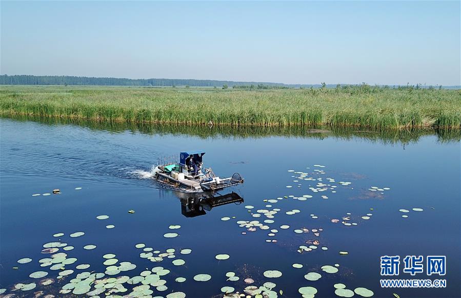 一艘打撈船在白洋淀景區內清理漂浮物(8月31日無人機拍攝)。記者從河北雄安新區管委會了解到,目前,雄安新區已轉入大規模實質性開工建設階段,今年69項重點建設項目已開工20個,剩余項目正在全力推進。京雄城際鐵路、千年秀林、白洋淀生態修復等項目建設穩步推進。新華社記者 牟宇 攝