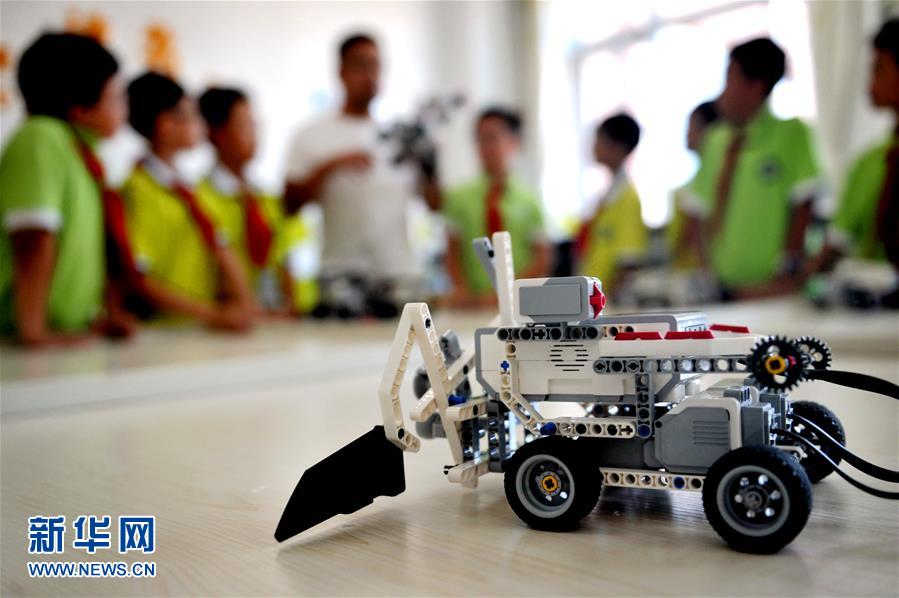 9月5日,在承德市雙橋區東園林小學,學生在老師的指導下學習機器人知識。2018年以來,河北省承德市雙橋區推出“三點半”課堂,依托校園特色社團并引入校外培訓機構為學生提供課后延時服務。學生可自愿在每天下午放學后參加舞蹈、足球、機器人等豐富多彩的社團活動。新華社記者 王曉 攝